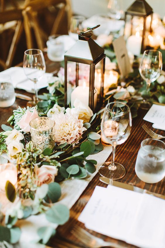 Greenery wedding centerpiece with lanterns